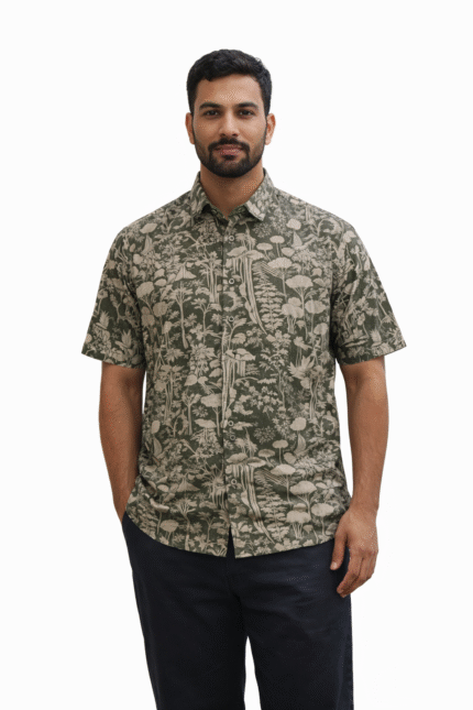 Men’s Olive Green Botanical Print Short Sleeve Button-Up Shirt