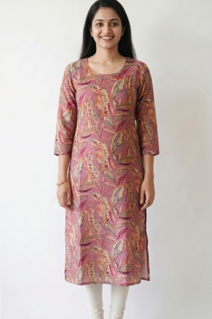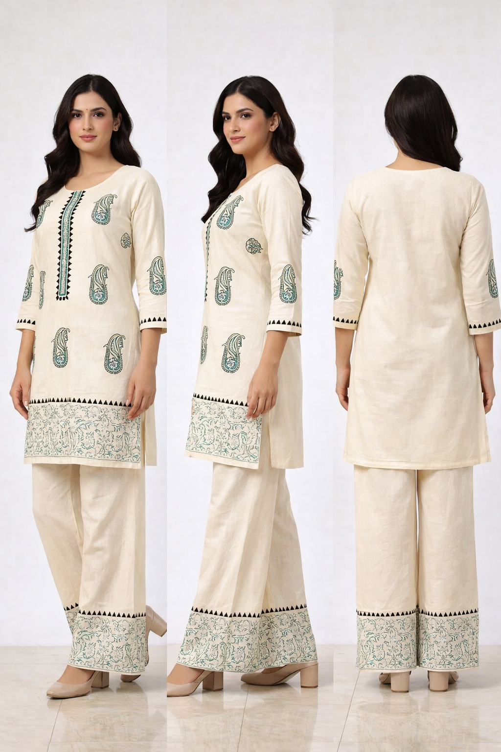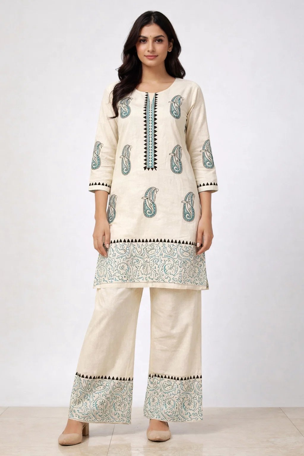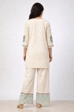 This cream ethnic kurta palazzo set combines classic design with modern comfort. The kurta features delicate paisley prints and a stylish neckline panel, while the wide palazzo pants add a flowy silhouette. it ensures comfort throughout the day. Ideal for office wear, casual outings, or small celebrations