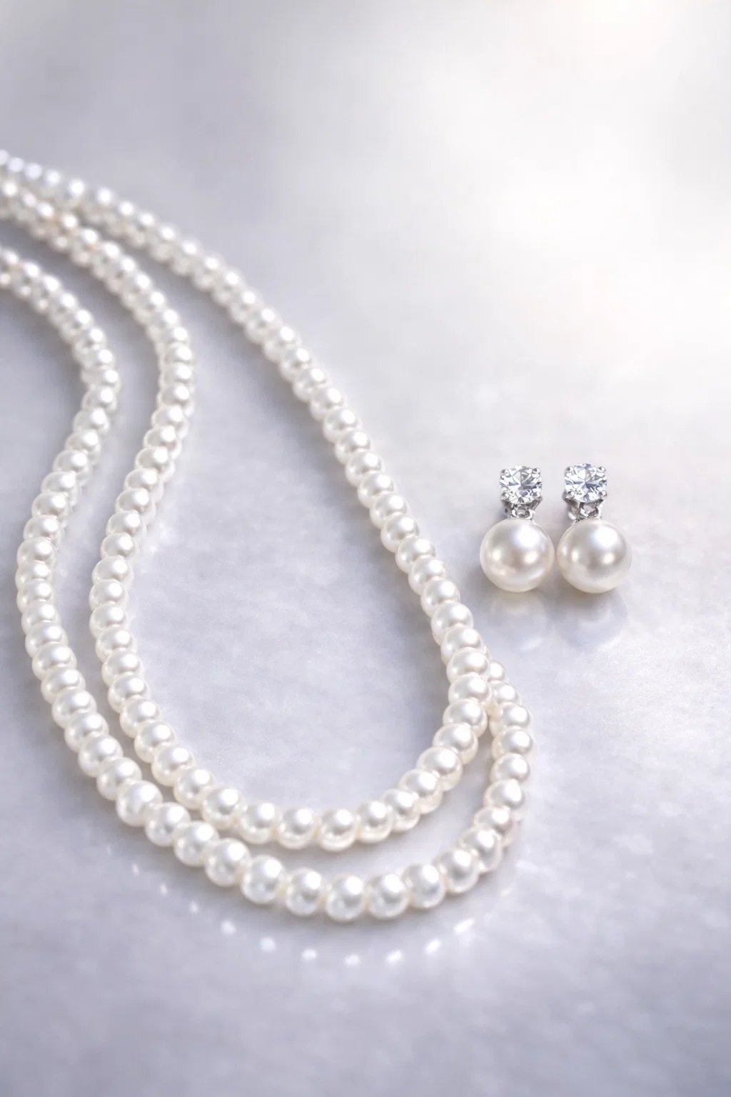 Pearl Necklace and Stud Earrings Set. Designed with perfectly round, lustrous white pearls, this classic set offers a sophisticated and graceful look that complements both traditional and modern outfits. The matching pearl stud earrings feature sparkling crystal tops that add a subtle shine, making the set perfect for special occasions as well as everyday wear