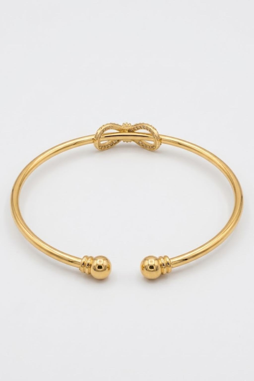 golden bow knot bracelet. Designed with a sleek open cuff structure, this bracelet features a delicate bow accent adorned with shimmering crystals that enhance its sophisticated appeal. Its minimalist yet stylish design makes it perfect for both casual outings and special occasions.