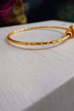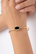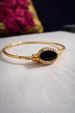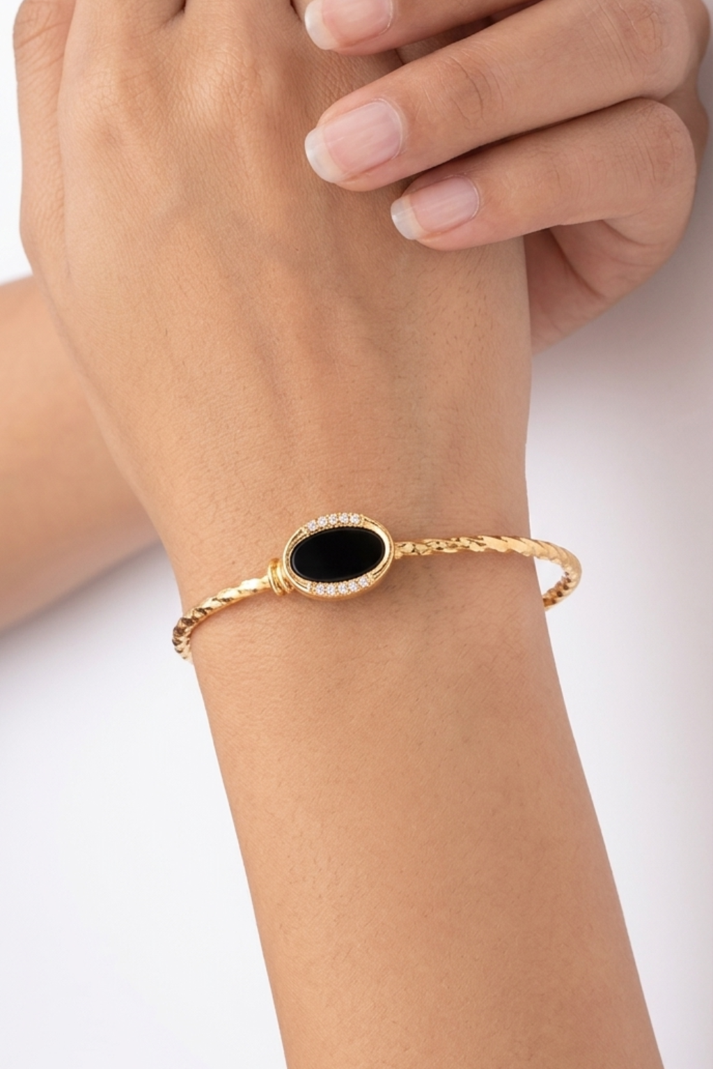 golden bracelet. Designed with a stunning oval black stone at the center, surrounded by sparkling cubic zirconia, this piece perfectly blends modern sophistication with timeless charm. The sleek textured band enhances its luxurious appeal, making it ideal for both casual and special occasions
