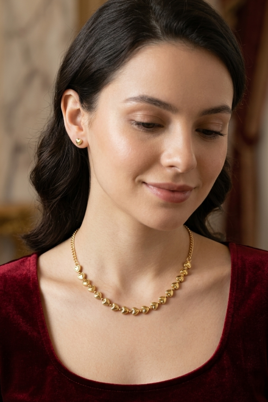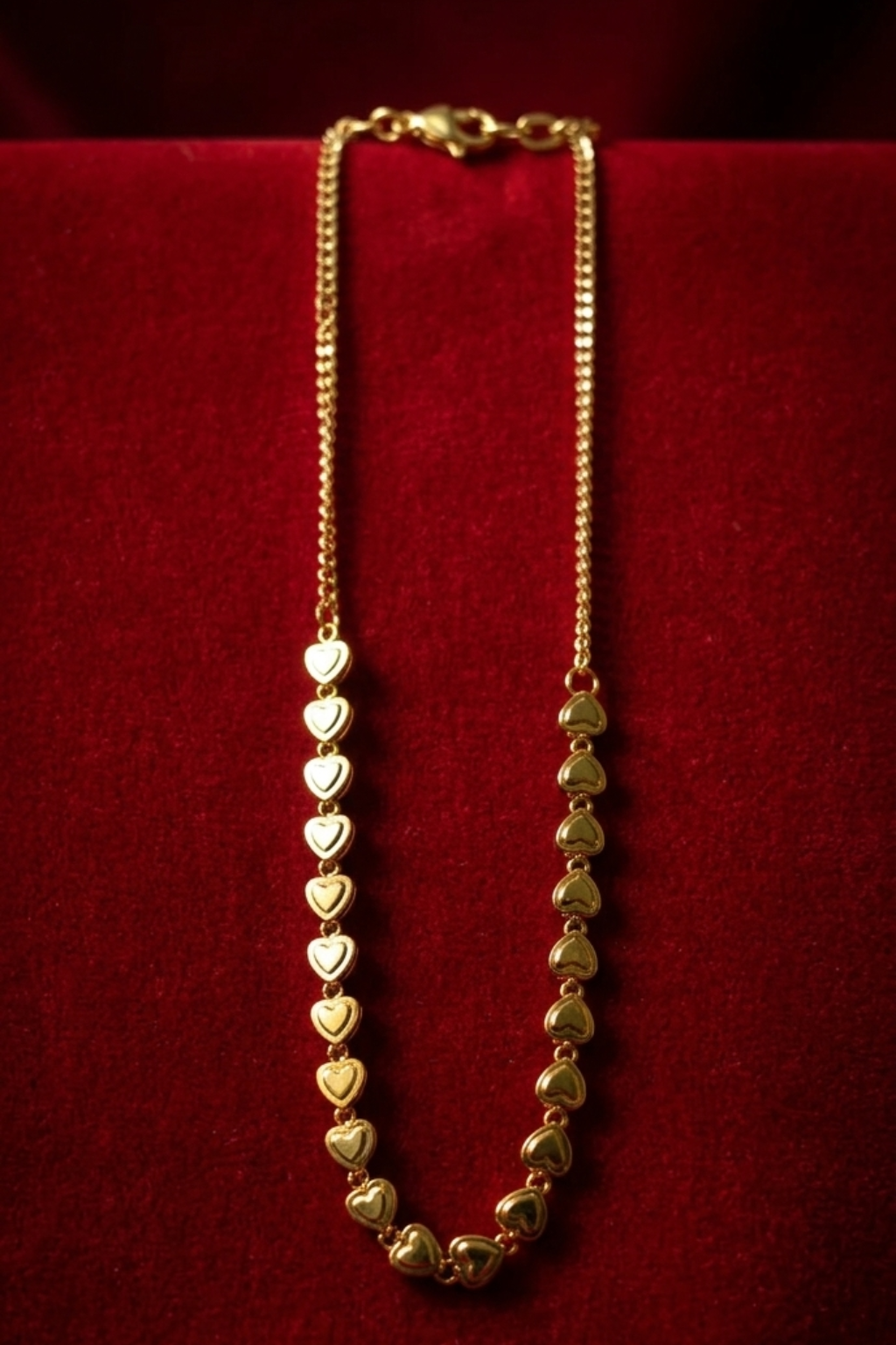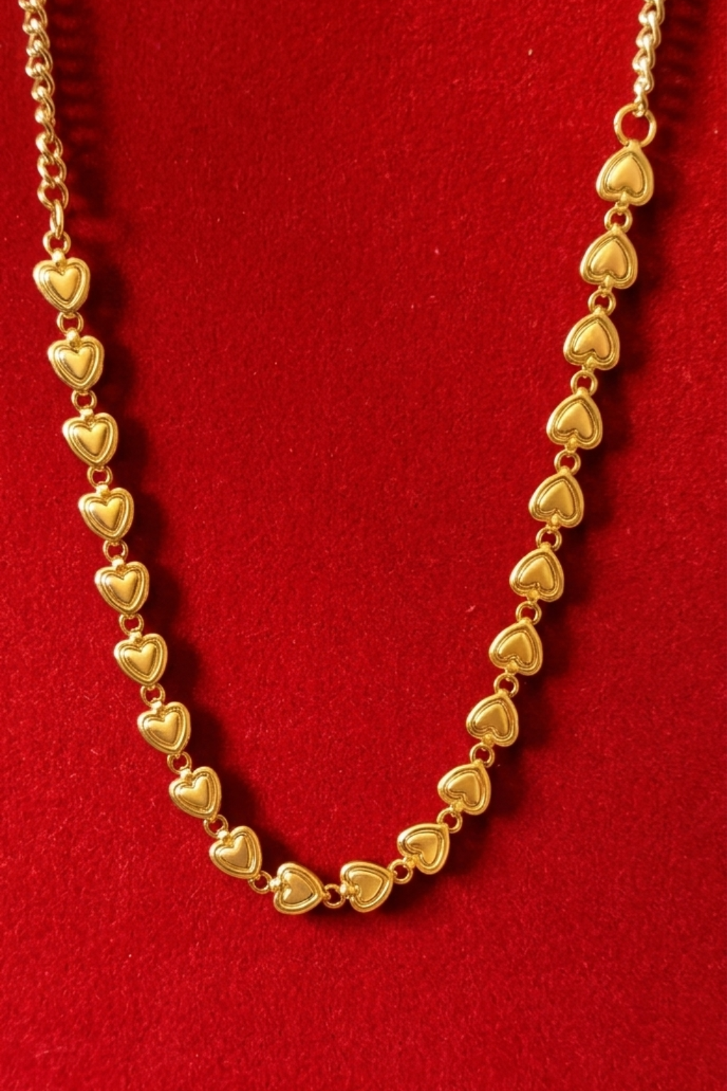 elegance and romance to your jewelry collection with this beautiful golden heart link necklace. Designed with a series of delicate heart-shaped charms, this piece symbolizes love and timeless style. Its sleek and minimal design makes it perfect for everyday wear, while the polished gold finish adds a subtle shine that enhances any outfit