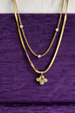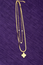 layered golden necklace . Designed with a modern double-layer style, this piece features a sleek snake chain paired with a delicate link chain adorned with subtle crystal accents. The highlight is the stunning clover-shaped pendant, symbolizing luck and timeless beauty.