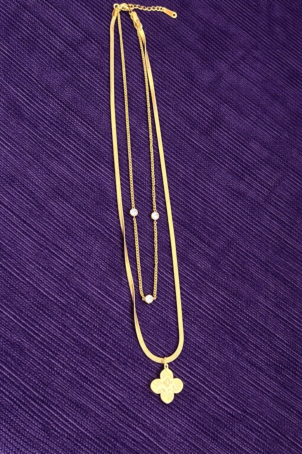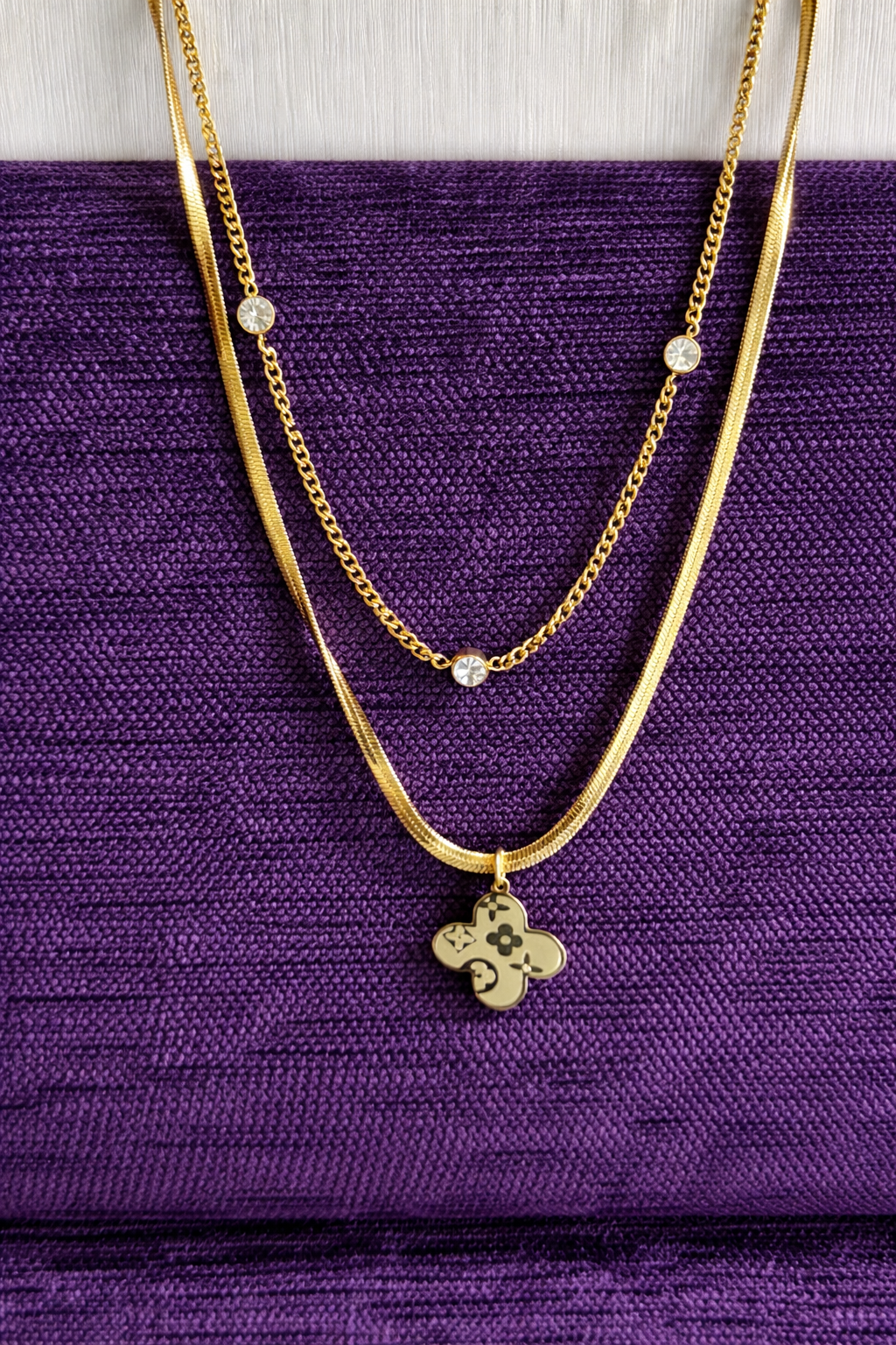 Be the first to review “Layered Gold Necklace for Women Dual Chain Design with Clover Pendant & Crystal Accents” Cancel reply