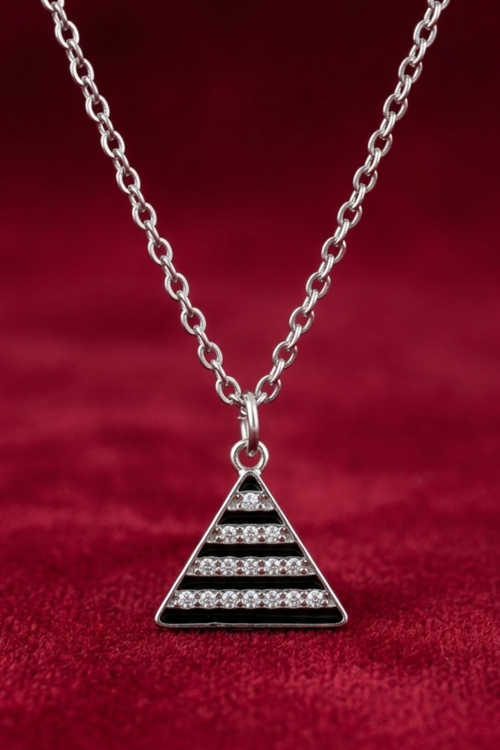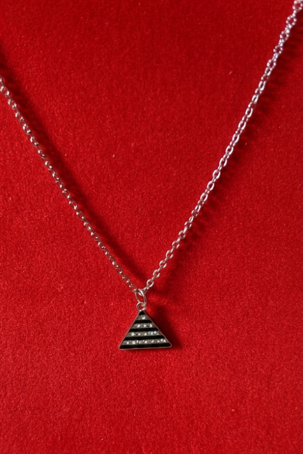 triangle pendant necklace. Designed for modern women and girls, this sleek geometric piece features a stylish black striped triangle charm suspended on a delicate silver-toned chain, creating a perfect balance of simplicity and sophistication.
