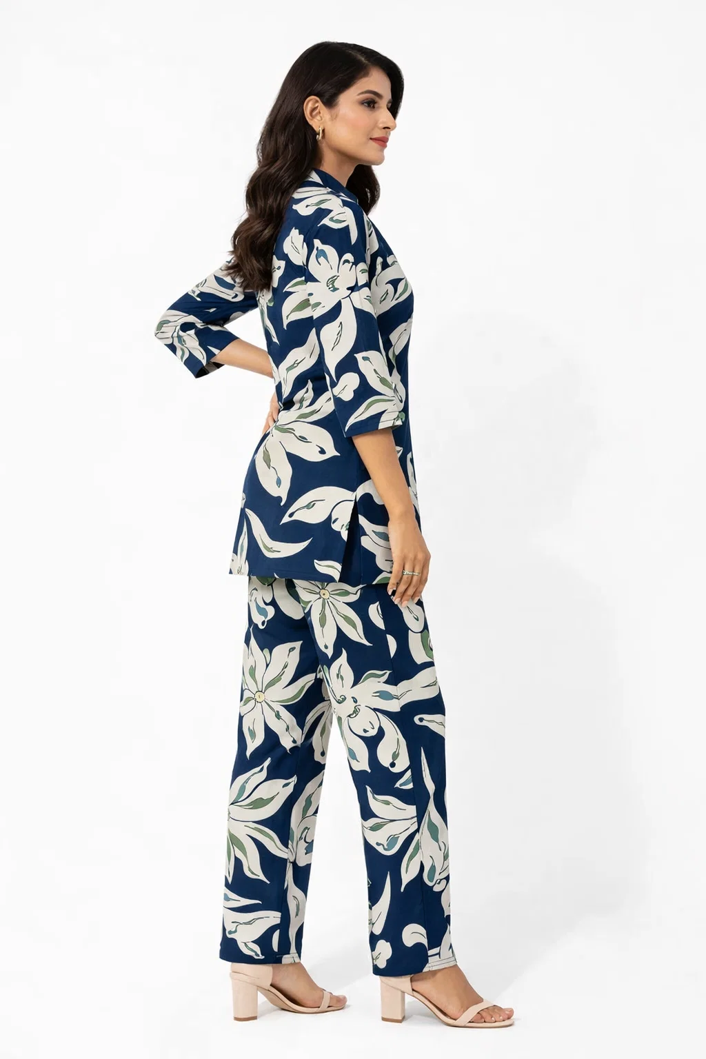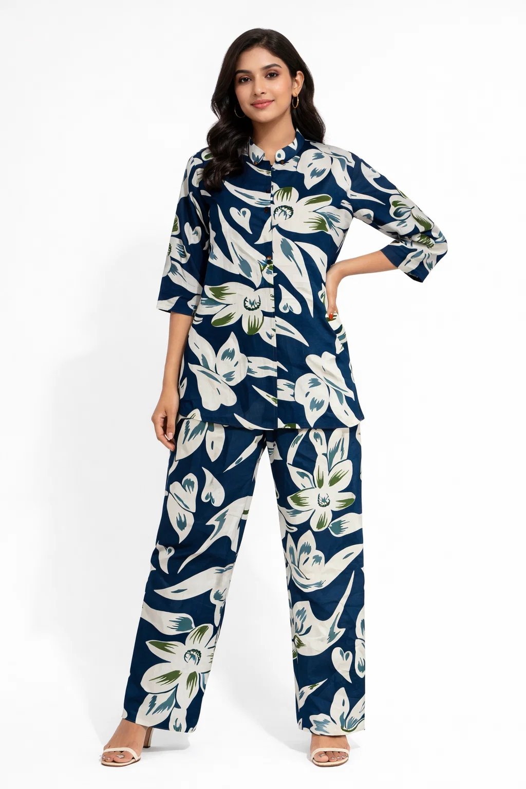 Elevate your everyday style with this elegant navy blue floral printed co-ord set. Featuring a stylish mandarin collar shirt with three-quarter sleeves and matching straight-fit pants, this outfit offers a perfect blend of comfort and sophistication