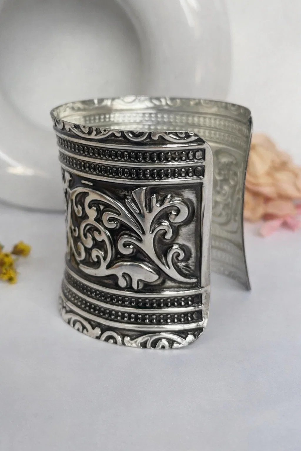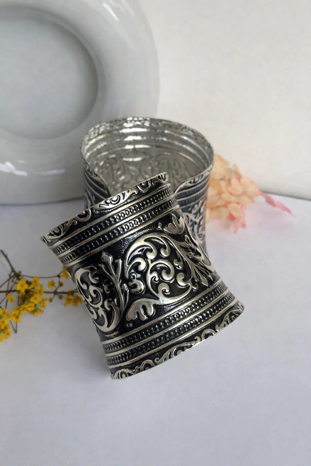 Oxidized Silver Kada for girls Engraved Pattern | Adjustable Cuff Style