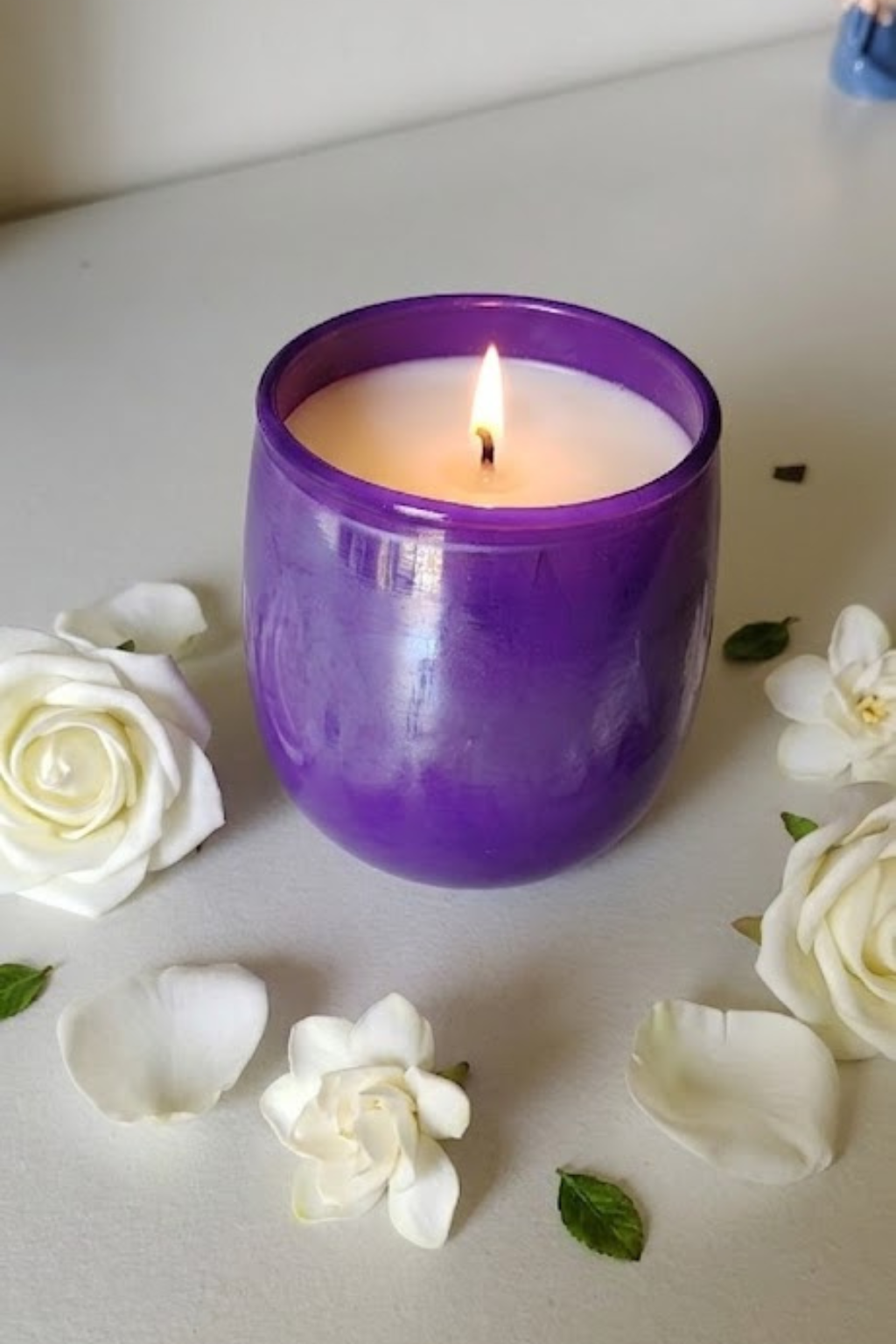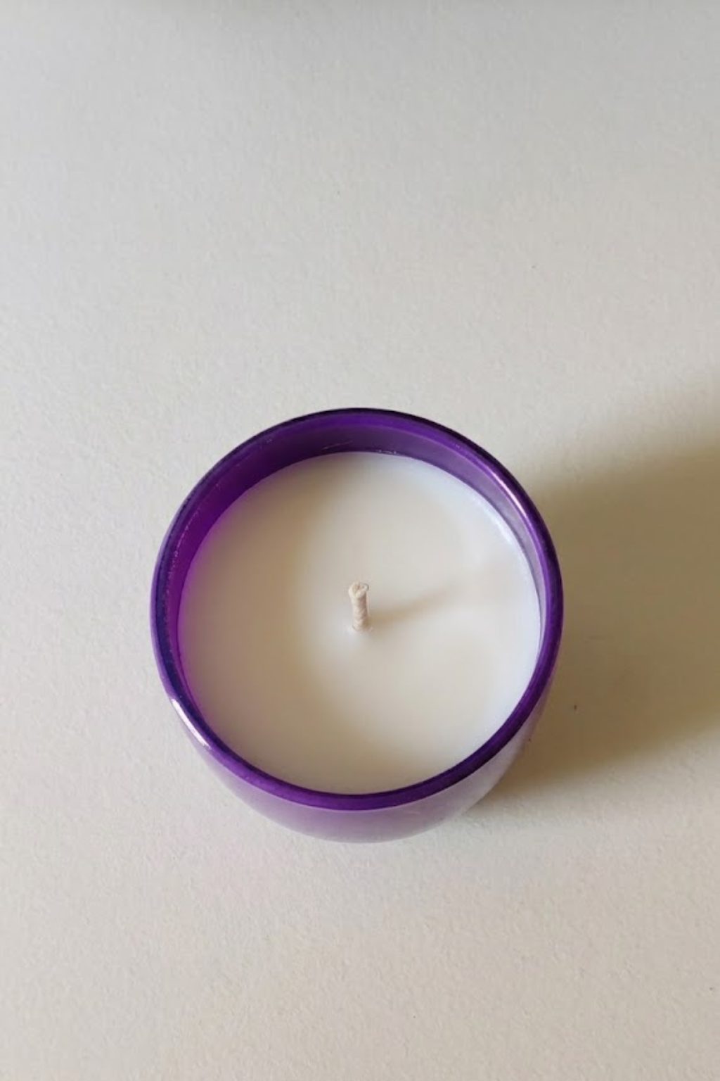 Purple Glass Jar Candle. Designed with a minimalist glass holder and a clean white wax finish, this candle adds a touch of beauty and relaxation to any space. The sturdy purple glass container not only enhances the look of the candle but also makes it a perfect decorative piece for your living room, bedroom, or offic