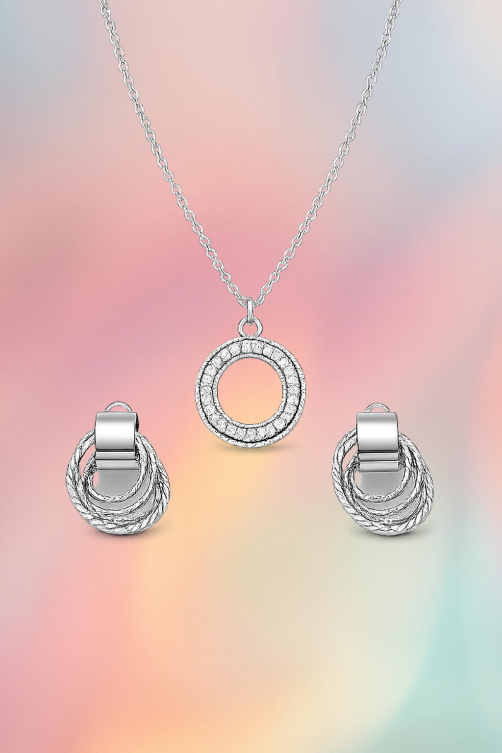 Make your outfit stand out with this silver jewelry set designed with a round pendant necklace and stylish textured earrings. A great choice for fashion lovers who enjoy modern and minimal designs