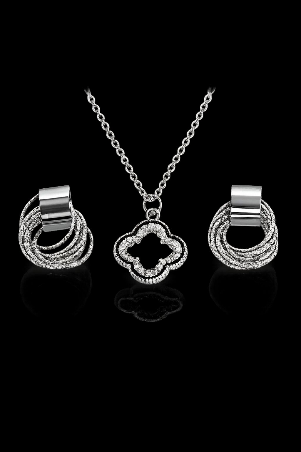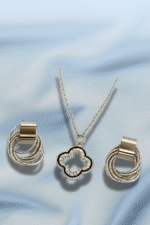 This stunning jewelry set includes a delicate silver chain with a charming clover pendant and stylish textured hoop earrings. Crafted with a sleek finish and unique design, it brings effortless elegance and sparkle to your look. A perfect accessory for parties, events, or everyday fashion