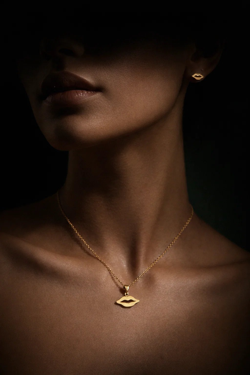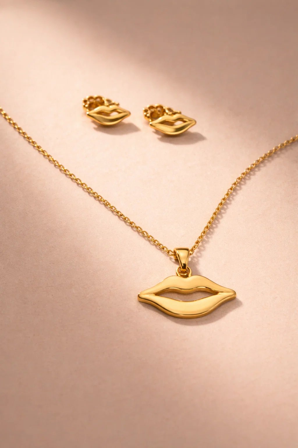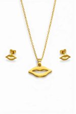 Golden lips pendant necklace set. Designed with a sleek lip-shaped pendant and matching stud earrings, this trendy jewelry set brings a modern and fashionable vibe to any outfit. The smooth golden finish and delicate chain make it perfect for everyday wear, parties, or special occasions. Lightweight and versatile, it pairs beautifully with both casual and dressy styles, making it a must-have accessory for your jewelry collection